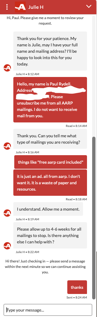 Turned 50 and AARP started ramping up the volume of mail they send me. I decided to see if I can get them to stop sending the mail now and save myself decades (I hope?) of junk mail.