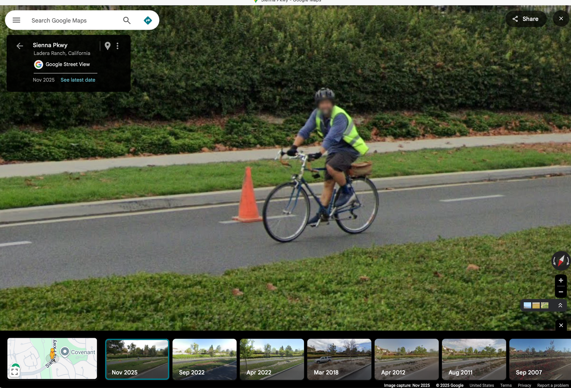 I saw the Street View car on my bike ride on November 12, 2025. I checked the view every few days to see if it had been updated. Today I checked on December 26, 2025 and it has been updated with the latest view, including me on my bike. So it took about 40 days.